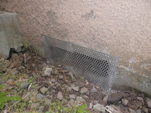 現状調査の時にネズミが侵入して来そうな場所を業者さんと綿密に打ち合わせをして対策を考えます。ネズミは指一本の太さ位の隙間があれば入ってこれるそうです。ここでは家の基礎の換気口の格子が折れてしまっている部分がありました。このようにネズミが侵入してくる可能性のある穴や隙間を見つけてネズミが齧れない金属のプレートや網を貼っていきます。