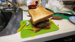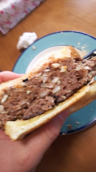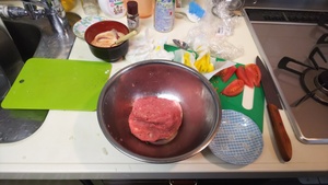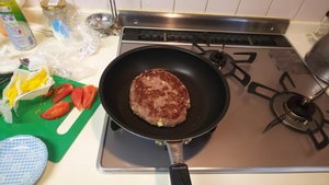 ハンバーグも作り、焼いて野菜のっけてパンにはさんで完成!見栄えは悪い!ですが味はなかなかになりました。