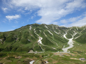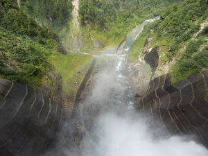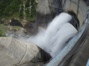 黒部の太陽で有名な黒部ダムです、ただ今放水中です