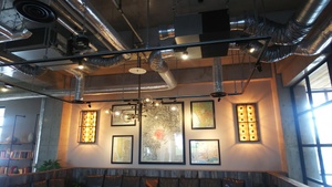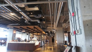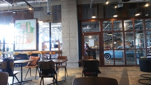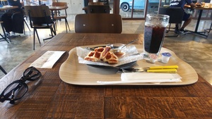 店内は仕切りなどはほとんどなく打ち放しのコンクリートの壁に空調設備のダクトや配線がむき出しの天井で粗く無機質な質感を出していますが、テーブル、椅子などインテリアにウッド素材を使用してそのバランスが良く取れて開放的でとてもモダンでおしゃれな空間を作っています。飾ってある絵画などや照明のライティングにもすごくこだわりを感じてとても内装インテリアの勉強になりました。ワッフルとアイスコーヒーを美味しくいただきました。(食べてばっかりです汗)隣にレストランもあるので次回行きたいと思います。